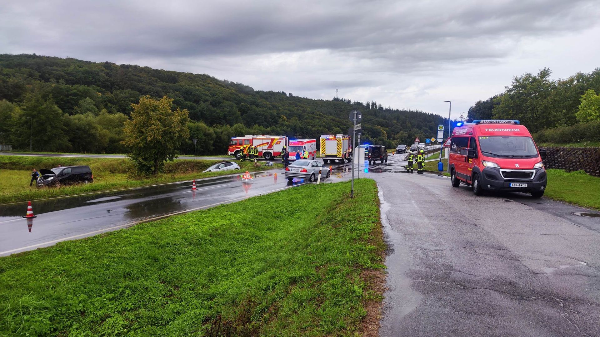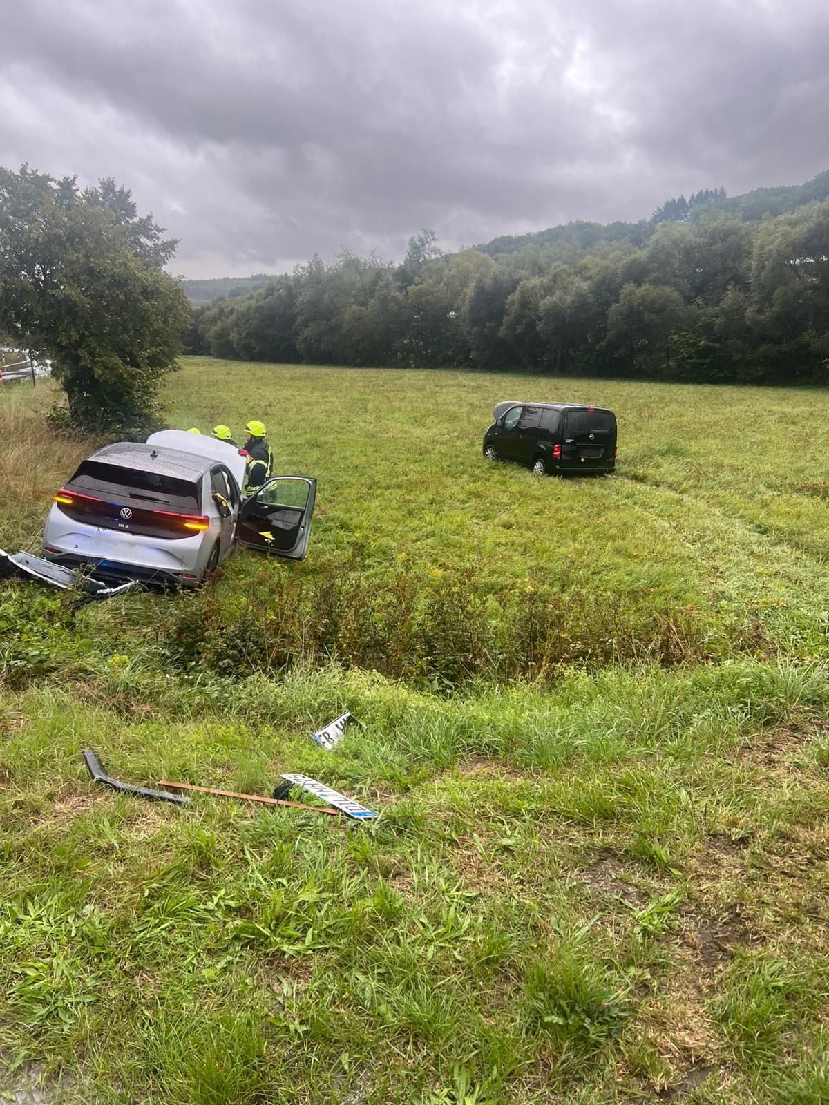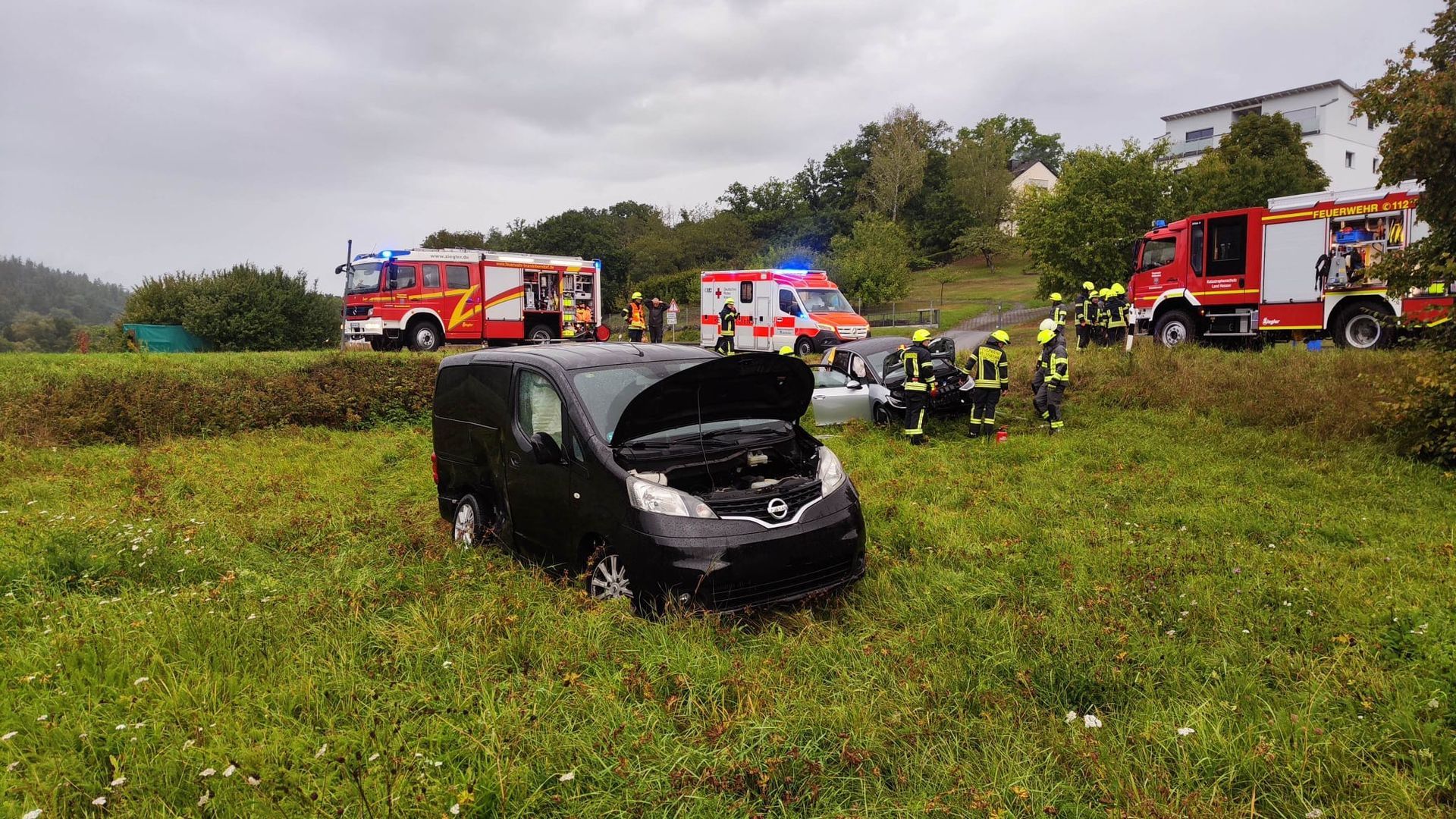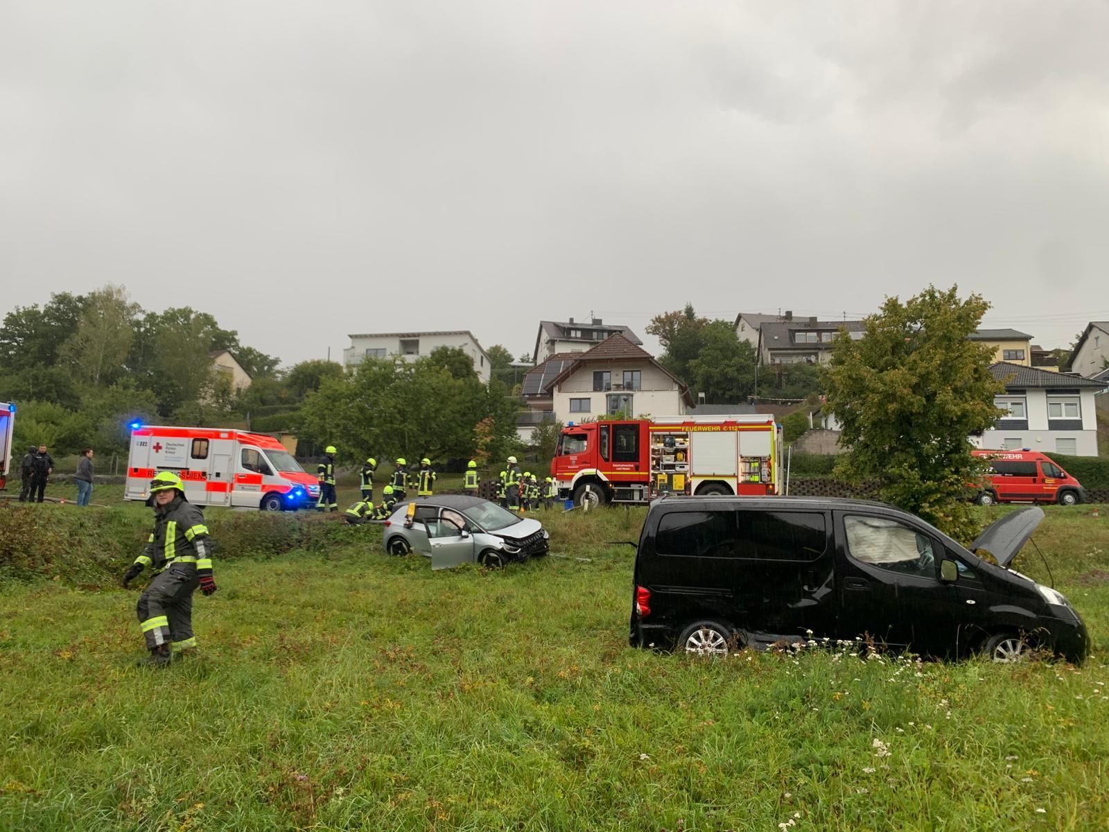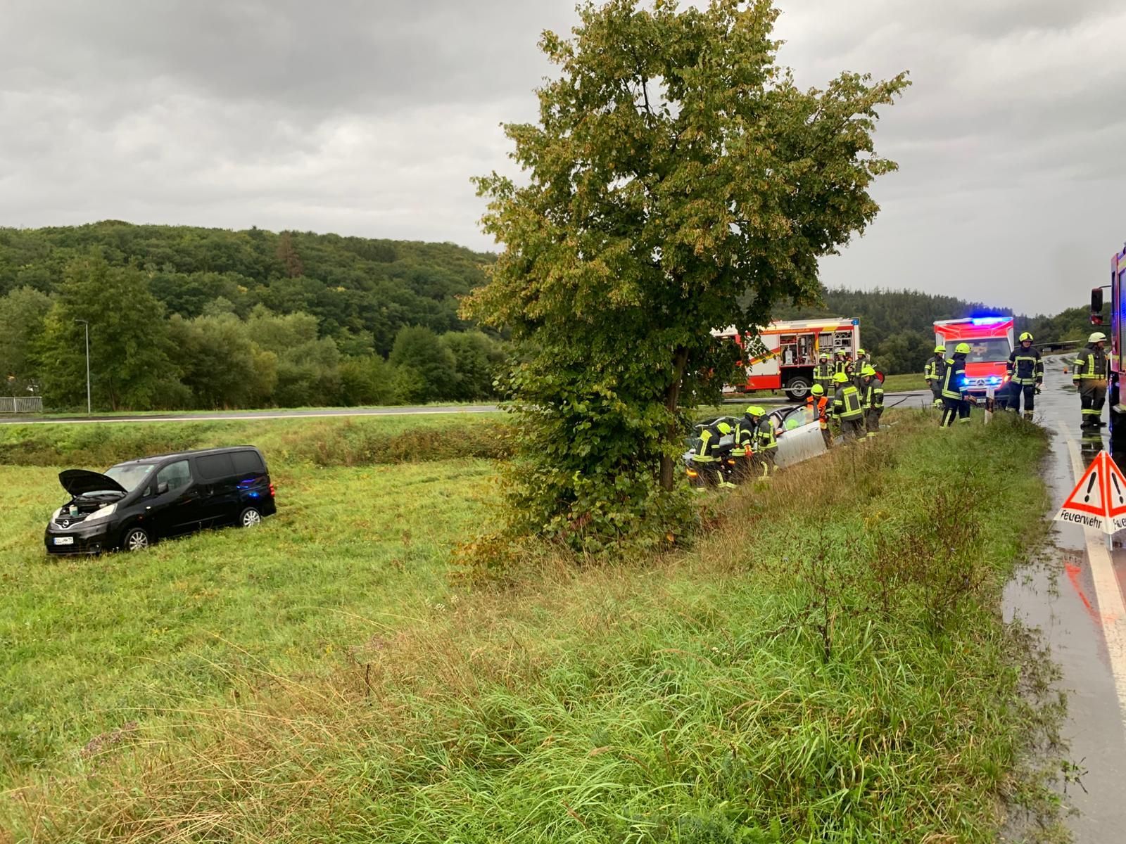 Zwei PKW waren im Kreuzungsbereich zusammengestoßen und anschließend in eine angrenzende Wiese geschleudert worden. Die Fahrer beider PKWs haben sich schon selbst aus ihren Fahrzeugen befreien können. Sie wurden vom gleichzeitig mit uns eintreffenden Rettungsdienst versorgt.