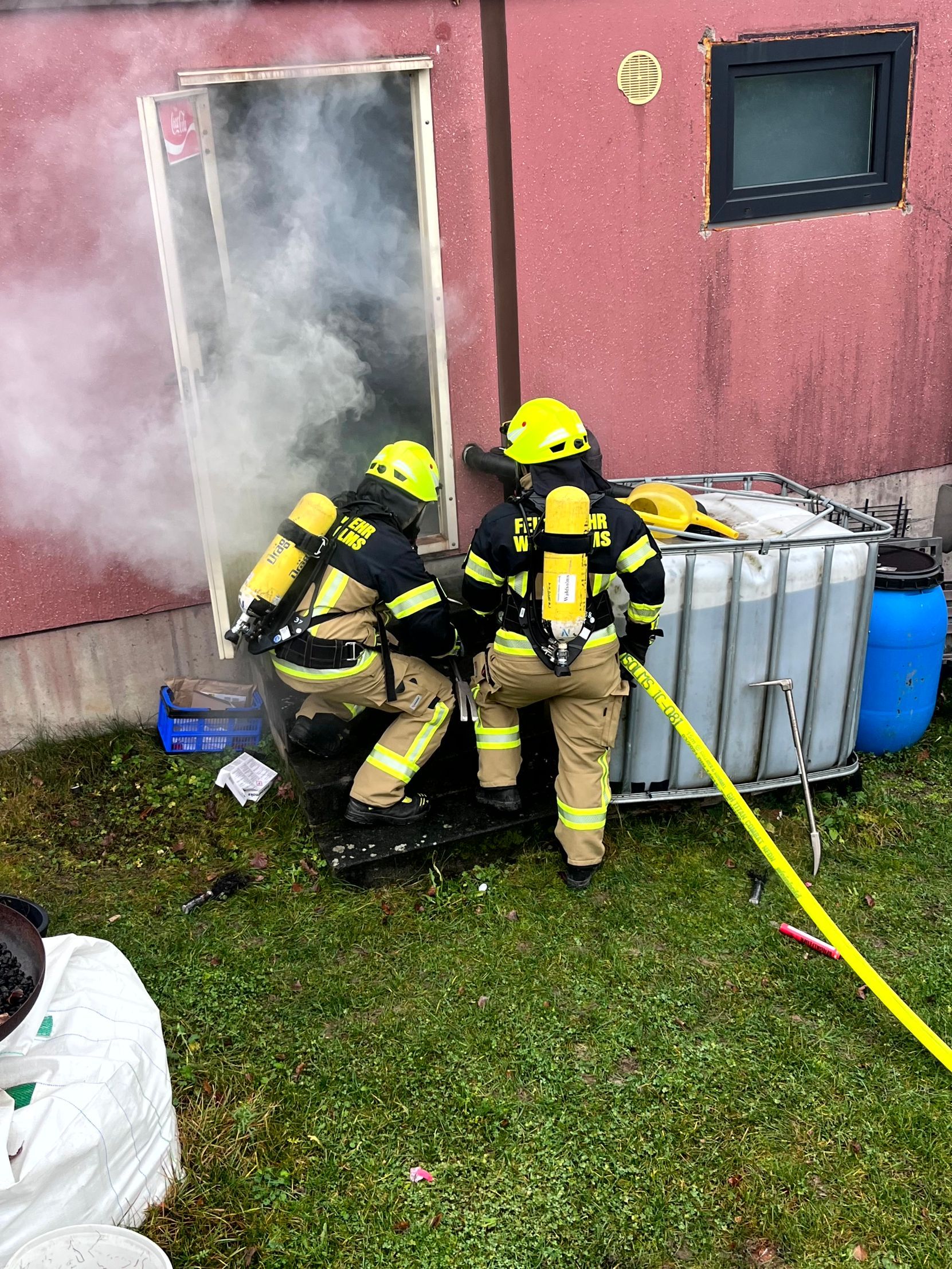 Die Einsatzkräfte begannen mit der Betreuung der Verletzten und gleichzeitig mit den Löscharbeiten. In der Garage, die mittlerweile verbraucht war, wurde noch eine Person vermisst. Diese wurde von einem Trupp unter Atemschutz gesucht, gefunden und gerettet.