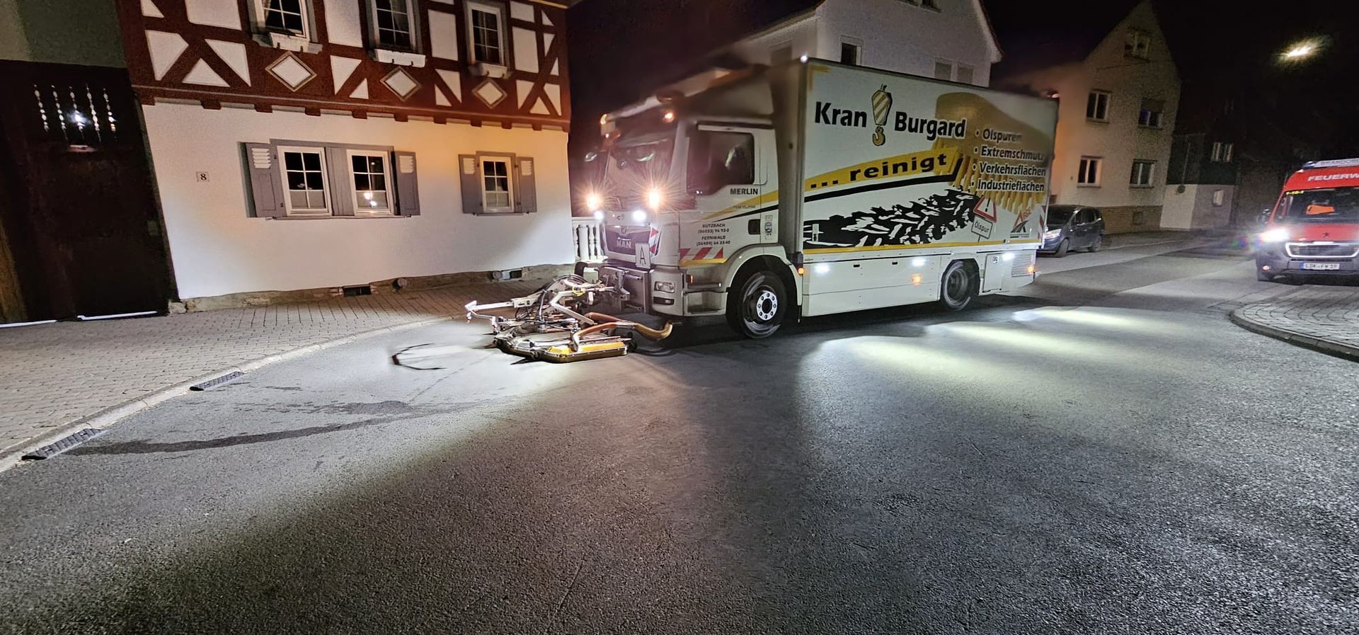 Aufgrund der Menge des ausgelaufenen Öl wurde die Firma Kran-Burgard GmbH bestellt, die mit einem Spezialgerät die Fahrbahn reinigte.